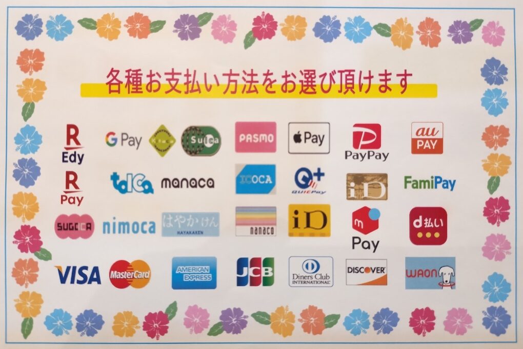 お支払いは各種カード決済、電子決済など様々な方法に対応しております。